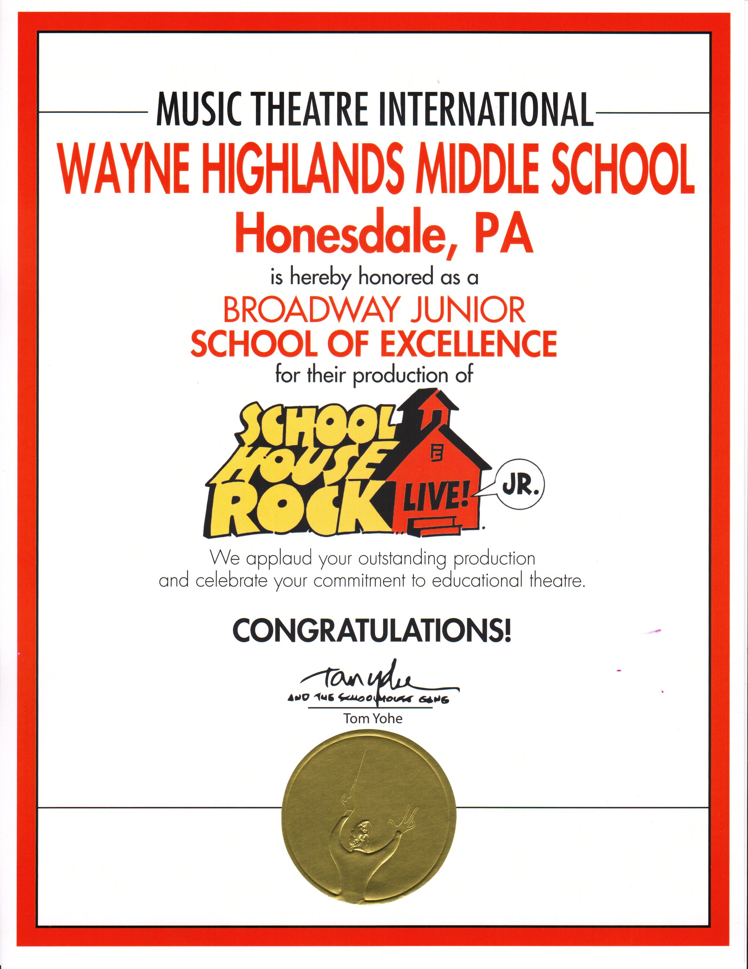 “Wayne Highlands Middle School is hereby honored as a BROADWAY JUNIOR SCHOOL OF EXCELLENCE for their production of School House Rock Live Junior,” stated Tom Yhoe (Original Composer of School House Rock Live); he continues, “Music Theatre International applauds your outstanding production and celebrates your commitment to educational theatre. Your vision has enabled young people to share in the greatest art of all: the art of living.Congratulations!”